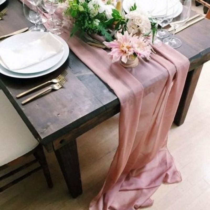 Le chemin de table en mousseline de couleur rose poudré donne un effet léger et romantique à votre table.